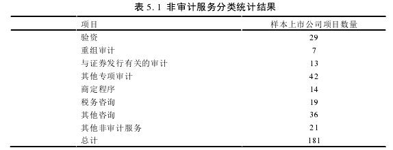 本文首先对样本上市公司购买的非审计服务的类型进行了统计。非审计服务中除财务报表审计和内控审计以外的鉴证服务包括:验资、重组审计、与证券发行有关的审计服务以及其他专项审计服务,非鉴证服务包括:商定程序、税务咨询、内控咨询等其他咨询以及其他非鉴证业务。由上表可以看出,在鉴证业务中,样本上市公司购买注册会计师验资服务的数量较多,另外其他专项审计项目数量较多,由于许多公司只披露了购买注册会计师专项审计服务的费用,而没有明确具体的专项审计服务类别,本文将这种情况的样本上市公司分类为购买其他专项审计服务的公司,因此其他专项服务的数量较多。而在非鉴证服务当中,样本上市公司购买咨询服务的数量较多,可见上市公司对注册会计师非鉴证业务的需求以咨询为主,其中税务咨询的需求较多,对于内部控制等咨询的需求也同样存在。由于有的上市公司同时购买了多项非审计服务,在统计的过程中样本有重复计入的情况,因此,购买非审计服务项目的总计数多于样本上市公司数量。